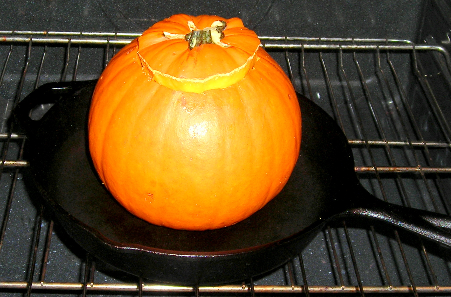 Put the "cap" back on and bake at 400 degrees for about an hour, or at a lower temperature for longer if you're baking something else at the same time (like the turkey). It's fully cooked when you can slip a knife into the pumpkin. Take it out and tent it with foil to keep it warm until you're ready to serve, and then use a large sharp knife to slice into wedges from top to bottom.